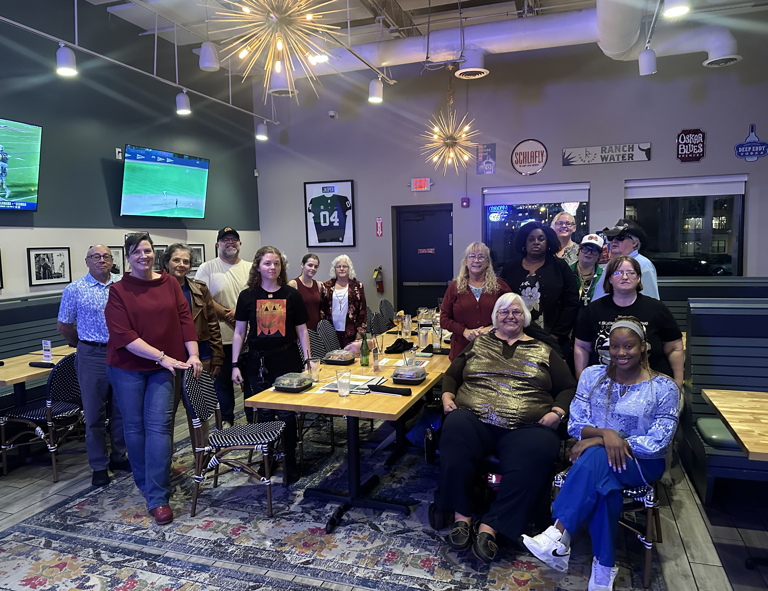 Disabled to the Front Advisory Council members celebrate at Jasper’s restaraunt on West End in Nashville, on September 25, 2025 to celebrate the passage of Resolution RS2025-1503 by the Metro City Council. They were joined by guests including Council Member Sandy Ewing who sponsored the resolution, the outgoing Chair of the Mayor’s Advisory Committee on People with Disabilities Mary Griffin, and our pals from NaviLens.
