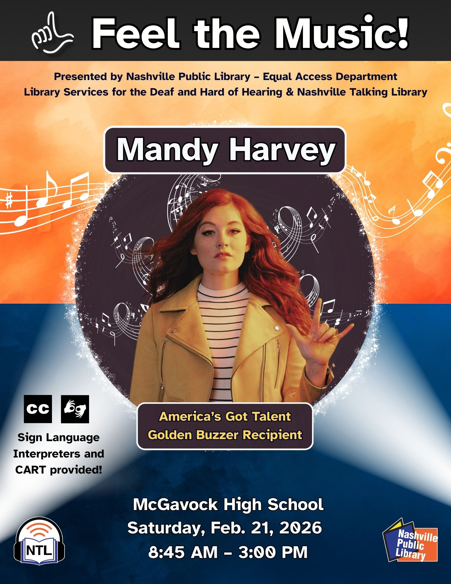 All performers and speakers in the ’58 room will provide visual descriptions of themselves as they take the stage. Lucas Rueb will provide American Sign Language (ASL) interpretations during the musical performances. PDFs of song lyrics will be available.